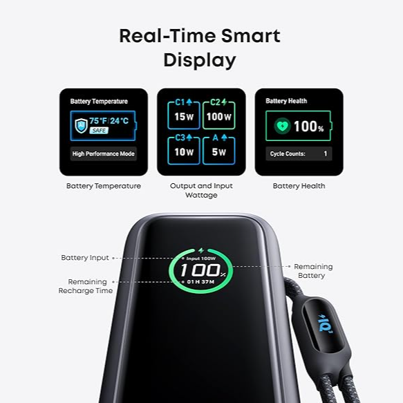 This power bank delivers a total output of 165W, making it capable of charging high-power devices such as laptops, tablets, and smartphones at impressive speeds. Its smart display offers real-time information about battery percentage, power output, and charging status, allowing users to stay informed and in control. The compact design ensures portability, while the durable construction makes it suitable for daily use.