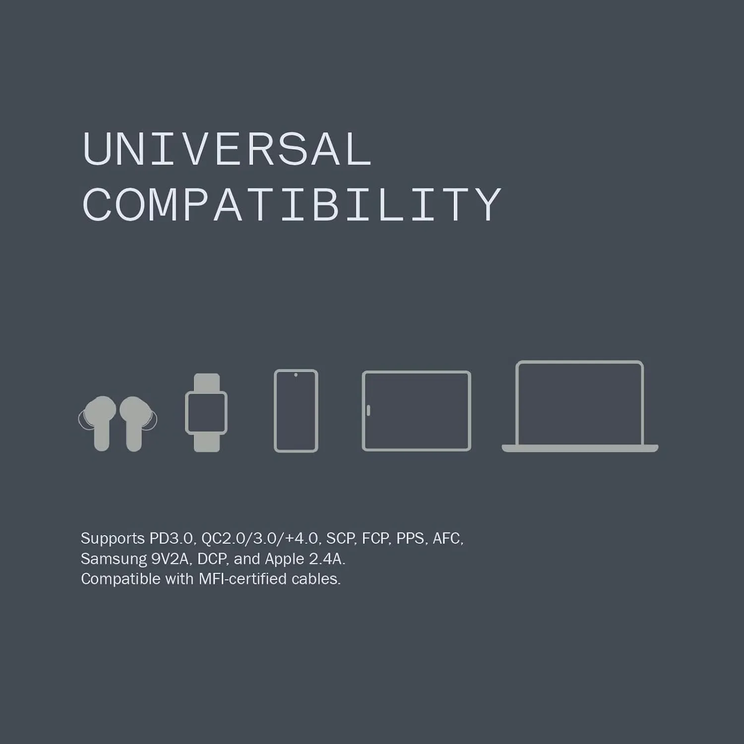 - Wide Compatibility: CMF Power 65W GaN works with all major fast charging protocols, including PD3.0, QC4.0+/3.0/2.0, SCP, FCP, PPS, AFC, Samsung 9V2A, DCP, and Apple 2.4A. Compatible with MFI-certified cables, guaranteeing optimal performance across a range of tech products.
