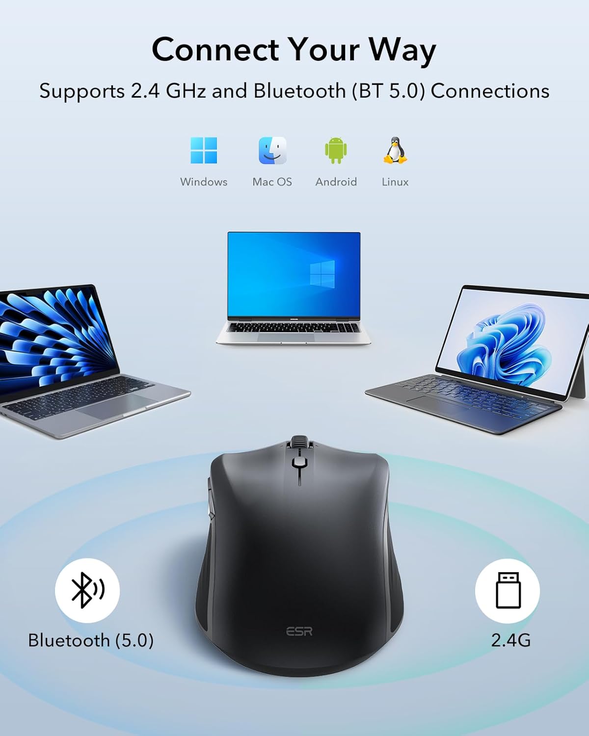 • 2.4 GHz or Bluetooth 5.0 connection
