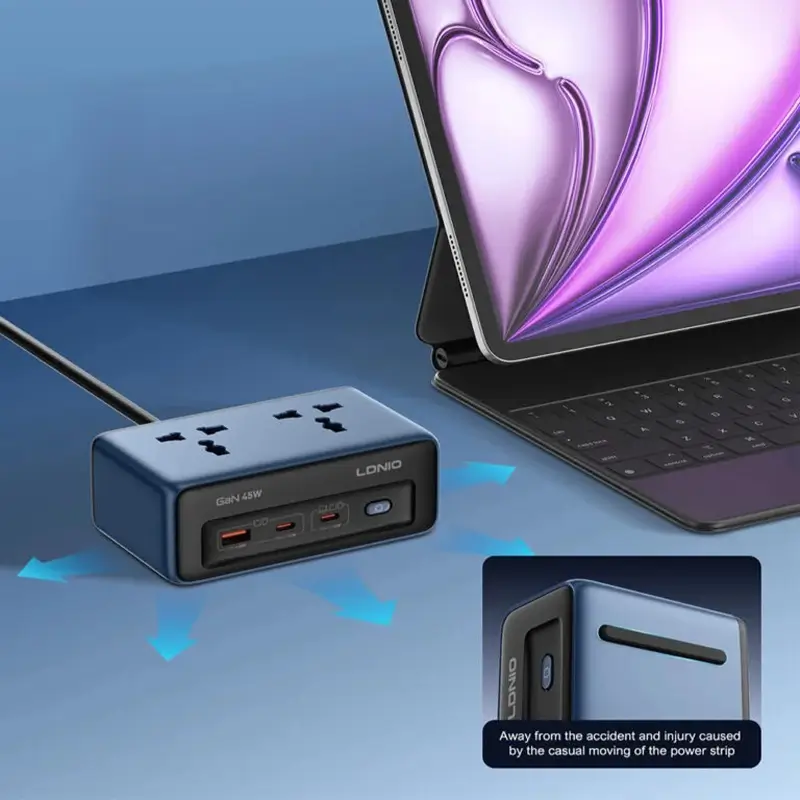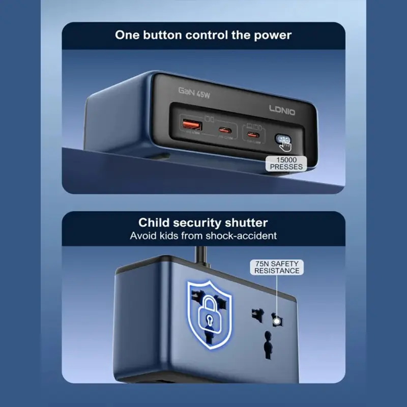 The LDNIO SC1 45W GaN PD Universal Socket Power Strip combines high-speed charging, universal compatibility, and compact design for homes, offices, and travel. Powered by advanced GaN technology, it delivers efficient, safe, and reliable energy to laptops, phones, and household devices. With intelligent power management, it ensures optimal charging for every device while maintaining safety and portability.