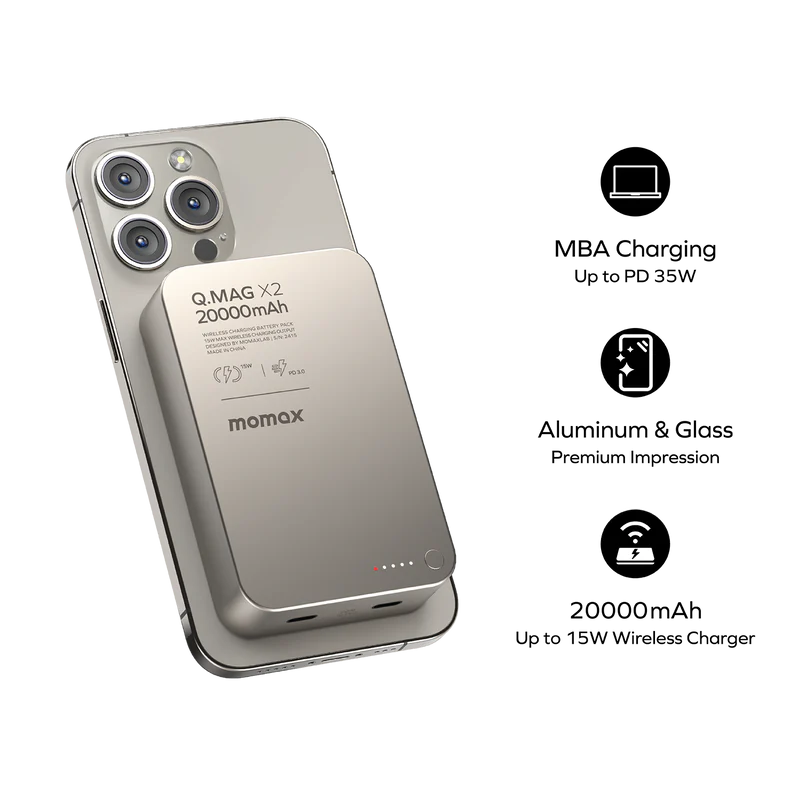 Step into the future of charging and discover it with the Q.MAG X2, a marvel of Momax innovation designed for the luxury traveler. Blending elegant design, powerful power and seamless convenience, this wireless battery pack will become your stylish charging companion.