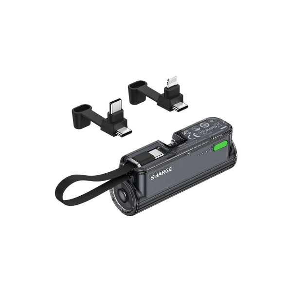 SHARGE Flow Mini 2 T1 is a compact 5000mAh transparent power bank with 22.5W fast charging, built-in USB-C cable, Lightning connector, LED indicator, and supports multiple fast charge protocols.