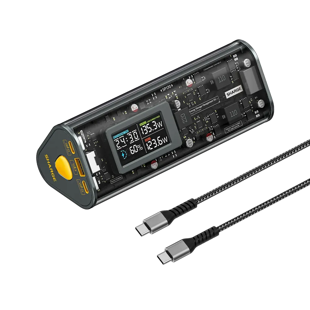 Shargeek 170 is a powerful 24000mAh power bank with 170W output, transparent design, smart display, triple-port fast charging, PD3.1 support, EV-grade cells, and airline-safe build.